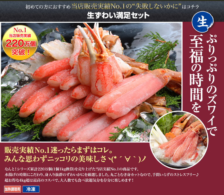 | 1位 | かに本舗 | 身入り◎、ボリューム◎、解凍ガイド付きで安心 | 約9,800~19,800円 | 家族・ギフト・初心者 |