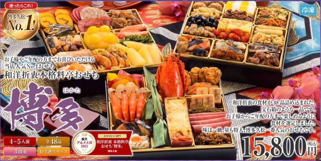 創業以来40年以上の歴史を持つ博多久松は、九州の味を活かしたボリューム満点のおせちが特徴。冷凍で届くため保存性も高く、価格に対して内容量が多いコスパ重視派に人気です。