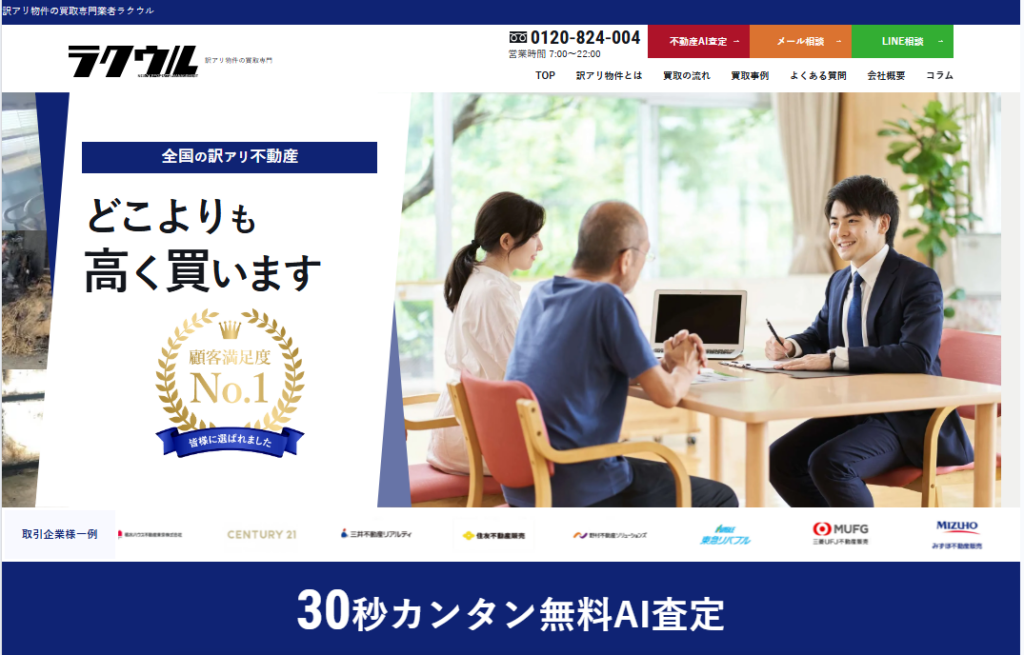 | 1位 | ラクウル | 事故物件・空き家・再建築不可・共有持分など | 全国 | 相談・査定無料 | 訳あり物件専門・直接買取・総合力が高い |