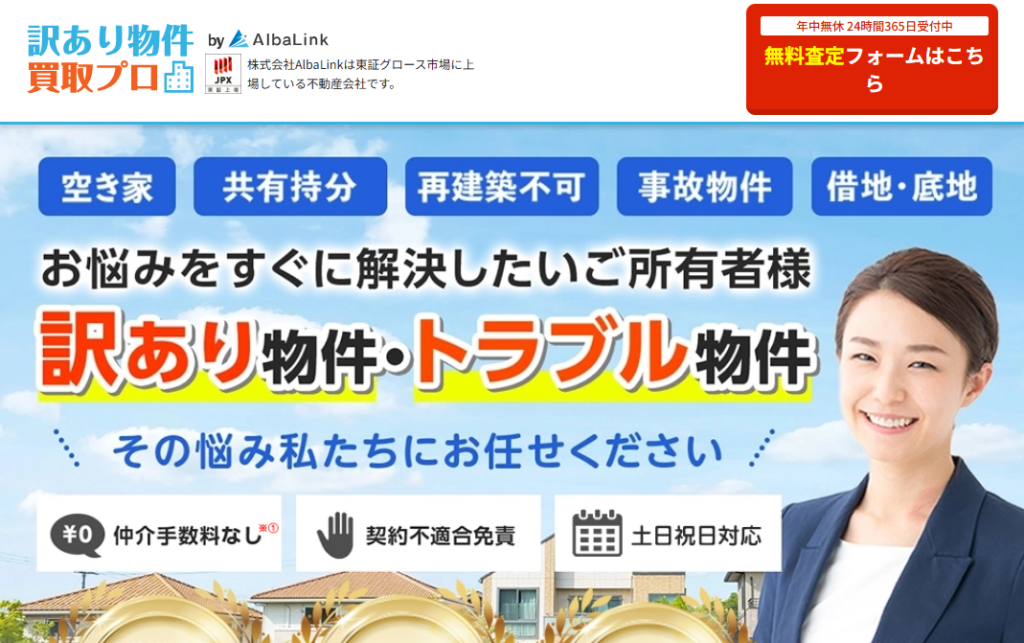 | 2位 | 訳あり物件買取PRO(AlbaLink) | 事故物件・再建築不可・底地・共有持分など | 全国 | 相談・査定無料 | 査定の柔軟さ・再販ネットワーク |