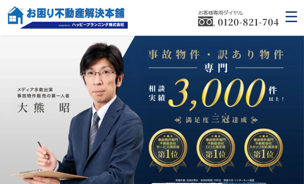 | 3位 | ハッピープランニング株式会社 | 事故物件・心理的瑕疵物件 | 主に都市部 | 相談・査定無料 | 事故物件特化・スピード重視 |